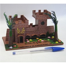 ARTESANATO (9,5X18X10,5 CM). MAQUETE CONFECCIONADA EM PAPELÃO, REPRESENTANDO PONTO TURÍSTICO DA CIDADE DE GARANHUNS-PE, O CASTELO DE JOÃO CAPÃO. CASTELO COM DUAS TORRES, PINTADO NA COR MARROM, COM UM JARDIM E DUAS PALMEIRAS À FRENTE. POSSUI, NA BASE, A INSCRIÇÃO 'CASTELO JOÃO CAPÃO / LEMBRANÇA DE GARANHUNS-PE'. NA PARTE POSTERIOR, NOME DA ARTISTA 'SELMA / 23 07 2010'.