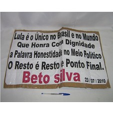 CARTAZ (42X60 CM) CONTENDO A INSCRIÇÃO 'LULA É O ÚNICO NO BRASIL E NO MUNDO QUE HONRA COM DIGNIDADE A PALAVRA HONESTIDADE NO MEIO POLÍTICO / O RESTO É RESTO E PONTO FINAL. / BETO SILVA / 23/07/2010'. TEXTO IMPRESSO SOBRE PAPEL BRANCO. ESTE, COLADO SOBRE BASE DE PAPELÃO MICROONDULADO.