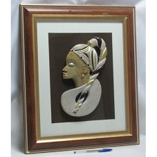 QUADRO (53,5X46 CM) COM MOLDURA EM MADEIRA, PASSE-PARTOUT BEGE E FUNDO MARROM, COM TAMPO DE VIDRO. SOBRE O TAMPO, ESCULTURA EM PEDRA (29X19 CM) RETRATANDO O PERFIL DE UMA MULHER.