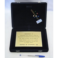 PLACA (11,5X16,5 CM) EM METAL DOURADO, CONTENDO A INSCRIÇÃO 'AGRADECIMENTO DA COMUNIDADE ÁRABE PALESTINA NO BRASIL AO EXCELENTÍSSIMO SR. PRESIDENTE LUIZ INÁCIO LULA DA SILVA PELO APOIO NA LUTA EM PROL DA CRIAÇÃO DO ESTADO PALESTINO E PELOS SERVIÇOS MUNDIAIS PRESTADOS NA CONSTRUÇÃO DE UMA PAZ JUSTA NO ORIENTE MÉDIO / SANT'ANA DO LIVRAMENTO/RS'. FIXADA NA PARTE INTERNA DE ESTOJO FORRADO DE VELUDO AZUL MARINHO.