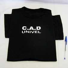 CAMISETA (TAM G) EM MALHA PRETA, DE MANGA CURTA. NA FRENTE, EM BRANCO, A INSCRIÇÃO 'C.A.D. UNIVEL'.