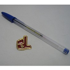 BÓTON (22X22 MM) EM METAL DOURADO, COM ANVERSO ESMALTADO EM VERMELHO E BORDAS DOURADAS. POSSUI O FORMATO DE UMA MÃO FAZENDO UM 'L'. AO CENTRO, UMA ESTRELA DORUADA.
