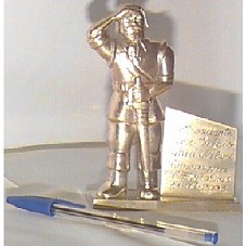 ESTÁTUA (13X6 CM), EM METAL DOURADO, DA FIGURA DE FERNÃO DIAS, EM PÉ, SEGURANDO UMA ESPADA EM UMA DAS MÃOS E, COM A OUTRA EM POSIÇÃO DE CONTINÊNCIA, VESTIDO DE UNIFORME, TENDO AO SEU LADO, PLACA (5X6 CM) COM A INSCRIÇÃO 'AO PRESIDENTE LUIZ INÁCIO LULA DA SILVA / HOMENAGEM C.C. FERNÃO DIAS / 18-08-2003'. FIXADA ATRAVÉS DE PARAFUSO À BASE METÁLICA (3,5X10,5 CM) DOURADA.