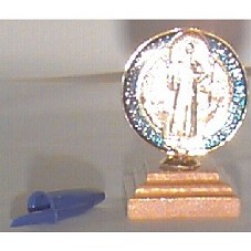 MEDALHA (4,5 CM) EM METAL DOURADO, COM BASE EM MESMO MATERIAL. EM UMA DAS FACES, CENTRALIZADA, EM DOURADO, IMAGEM DE UM SANTO SEGURANDO UMA CRUZ E UM LIVRO, TENDO AOS LADOS A INSCRIÇÃO 'CRVX / S-PA / TRIS / BEN / EDIC / TI', NA BORDA, ESMALTADA DE AZUL, 'EIVS IN OBITUNRO PRA SENTIA MVNIAMVR'. NA OUTRA FACE, DESENHO DE UMA CRUZ COM DETALHES CIRCULARES NAS PONTAS, EM DOURADO, COM A INSCRIÇÃO 'CSSML / NDSMD' E AS LETRAS 'C / S / P / B', NA BORDA, ESMALTADA DE AZUL, 'S / M / Q / L / I / V / B / PAX / V / R S / N / S / M / V'. FIXADA EM BASE DE MADEIRA (4X4X1,5 CM) ESCALONADA, TENDO NA PARTE INFERIOR UMA ETIQUETA 'PETRUS LIVRARIA'. ACONDICIONADA EM CAIXA DE PAPELÃO AZUL, COM FURO OVAL NA FRENTE E A MESMA ETIQUETA.