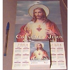 CALENDÁRIO DE PAREDE (18X32 CM) DO ANO DE 2004, COM IMAGEM DE JESUS CRISTO NO CENTRO SUPERIOR, E A INSCRIÇÃO 'CORAÇÃO DE JESUS ABENÇOAI ESTE LAR!'. NA PARTE INFERIOR, OS MESES, TENDO AO CENTRO UMA FOLHINHA, COM PÁGINAS DE CADA DIA DO ANO E MENSAGENS'. ACOMPANHA CARTÃO DE VISITA DO REMETENTE 'MARIA IGNEZ GIRALDI'.
