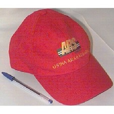 BONÉ EM TECIDO VERMELHO, TENDO BORDADO NA FRENTE, EM AMARELO, VERDE E BRANCO 'ARS ENERGIA / USINA ARARAQUARA'. REGULAGEM DO BONÉ EM VELCRO.