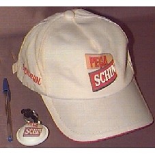 BONÉ EM TECIDO BEGE. NA FRENTE, EM VERMELHO, BRANCO E LARANJA, 'PEÇA SCHIN'; NAS LATERAIS, ' SCHINCARIOL' E 'EXPO FACIRA 2003 / SCHINCARIOL'. ACOMPANHA CHAVEIRO BRANCO, REDONDO, EMBORRACHADO E FOFO, TENDO EM UM DOS LADOS 'PEÇA SCHIN' E NO OUTRO 'EXPO FACIRA 2003'.