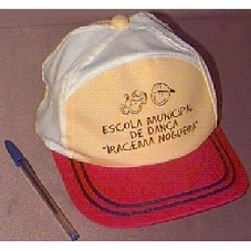 BONÉ NAS CORES AMARELO E BRANCO, E ABA VERMELHA COM FRISO PRETO. NA FRENTE, EM PRETO, DESENHO ESTILIZADO DE UM ROSTO DE MENINO E OUTRO DE MENINA, COM A INSCRIÇÃO 'ESCOLA MUNICIPAL DE DANÇA 'IRACEMA NOGUEIRA''.