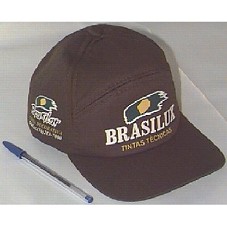 BONÉ EM TECIDO VERDE MUSGO, ACOLCHOADO INTERNAMENTE COM MANTA ACRÍLICA. NA FRENTE, BANDEIRA DO BRASIL ESTILIZADA, E A INSCRIÇÃO 'BRASILUX TINTAS TÉCNICAS'. NAS LATERAIS ' 10 ANOS / BRASILUX / O BRASIL TEM NOSSAS CORES.' E, 'BRASILAR / LINHA DECORATIVA / TELEFAX: (16) 283-7000'.