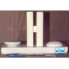 ESCULTURA EM MÁRMORE BRANCO (19,5X5X11 CM), REPRESENTANDO O CONGRESSO NACIONAL. FIXADA EM BASE RETANGULAR (21X7X2 CM) DE MESMO MATERIAL, TENDO NA FRENTE E ATRÁS, ETIQUETA AZUL COM A INSCRIÇÃO 'MARMORARIA GRAMAR / (16) 282-4614 / 282-1730'.
