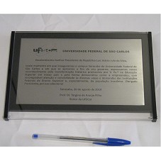PLACA (11,5X19,5 CM) EM AÇO ESCOVADO, CONTENDO A INSCRIÇÃO 'UNIVERSIDADE FEDERAL DE SÃO CARLOS / EXCELENTÍSSIMO SENHOR PRESIDENTE DA REPÚBLICA LUIZ INÁCIO LULA DA SILVA, NESTE MOMENTO EM QUE INAUGURAMOS O CAMPUS SOCORABA DA UNIVERSIDADE FEDERAL DE SÃO CARLOS E EM QUE SE APROXIMA O FIM DE SEU GOVERNO, EXPRESSAMOS NOSSO RECONHECIMENTO PELA TRANSFORMAÇÃO HISTÓRICA PROMOVIDA POR V. EXA. NA EDUCAÇÃO SUPERIOR EM NOSSO PAÍS E PELA FORMA DEMOCRÁTICA COMO A EMPREENDEU, COM INCOMPARÁVEL ATENÇÃO E SENSIBILIDADE ÀS DIVERSAS VOZES E DEMANDAS DAS INSTITUIÇÕES FEDERAIS DE ENSINO SUPERIOR E, ESPECIALMENTE, DA POPULAÇÃO BRASILEIRA. OBRIGADO PRESIDENTE, POR SUA SABEDORIA / SOROCABA, 20 DE AGOSTO DE 2010 / PROF. DR. TARGINO DE ARAUJO FILHO / REITOR DA UFSCAR'. PLACA FIXADA EM MOLDURA DE ACRÍLICO PRETO, COM TAMPO EM ACRÍLICO TRANSPARENTE. O CANTO INFERIOR ESQUERDO DO ACRÍLICO PRETO ENCONTRA-SE RACHADO.