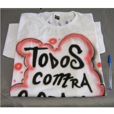 CAMISETA (TAM G) EM MALHA BRANCA, DE MANGA CURTA. NA FRENTE, ESTAMPA EM SPRAY, NAS CORES VERMELHO E PRETO, CONTENDO A INSCRIÇÃO 'TODOS CONTRA O CRACK'. ATRÁS, 'LULA / JUVENTUDE / 1314'.