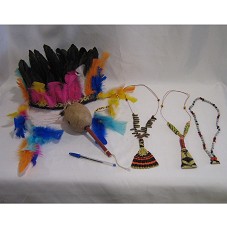 COCAR INDÍGENA CONFECCIONADO COM PENAS COLORIDAS FIXADAS EM TIARA DE PALHA TRANÇADA. ACOMPANHA TRÊS COLARES CONFECCIONADOS EM SEMENTES DIVERSAS, PALHA E ALGODÃO; E UM CHOCALHO EM CABAÇA, ORNADO COM PENAS.