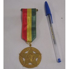 CONDECORAÇÃO NACIONAL DE PRIMEIRO GRAU 'MEDALHA AMILCAR CABRAL'. MEDALHA EM METAL DOURADO, PENDENTE À FITA DE GORGURÃO COM LISTRAS VERTICAIS NAS CORES VERMELHO, AMARELO E VERDE. MEDALHA NO FORMATO DE UMA ESTRELA INSCRITA EM UM CÍRCULO. NO CENTRO DA ESTRELA, EFÍGIE DE AMÍLCAR CABRAL. NO CÍRCULO, RAMOS DE OLIVA. NO REVERSO, A INSCRIÇÃO 'AMILCAR CABRAL - MEDALHA - CORAGEM - DECISÃO'. ACONDICIONADA EM ESTOJO FORRADO DE VELUDO VINHO.