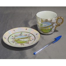 XÍCARA DE CHÁ (7,5X8X8 CM) CONFECCIONADA EM PORCELANA, ACOMPANHADA DE PIRES, EM MESMO MATERIAL. AMBOS POSSUEM PINTURA FURTACOR, COM DETALHES EM DOURADO, E PINTURA CENTRAL MOSTRANDO AS DUAS FACHADAS PRINCIPAIS DO PALÁCIO DA ALVORADA. PRÓXIMO A ESTA PINTURA, A INSCRIÇÃO 'PALÁCIO DA ALVORADA - BRASÍLIA'. ACONDICIONADA EM CAIXA CIRCULAR BRANCA, COM LISTRAS VERMELHAS.