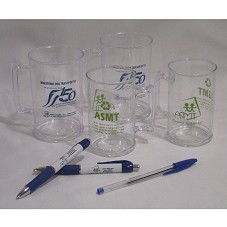 CONJUNTO DE QUATRO CANECAS CONFECCIONADAS EM PLÁSTICO TRANSPARENTE. DUAS DELAS (12X8X8 CM CADA) POSSUEM A INSCRIÇÃO, EM AZUL, 'MINISTÉRIO DOS TRANSPORTES / 28 DE JULHO DE 1860 / 150 ANOS / ABRINDO CAMINHOS PARA O DESENVOLVIMENTO / ASSOCIAÇÃO DOS SERVIDORES DO MINISTÉRIO DOS TRANSPORTES', E LOGOMARCA DA ASSOCIAÇÃO. AS OUTRAS DUAS (11X6,5X6,5 CM CADA), POSSUEM ESTAMPA EM VERDE, COM LOGOMARCA DA ASSOCIAÇÃO, NOME E CONTATOS. ACOMPANHAM DUAS CANETAS ESFEROGRÁFICAS, COM CORPO EM PLÁSTICO BRANCO, E DETALHES EM AZUL, COM MESMA INSCRIÇÃO.