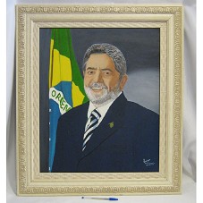 QUADRO (78X68 CM) COM MOLDURA E PASSE-PARTOUT BEGE, EMOLDURANDO PINTURA SOBRE TELA (58,5X49 CM) COM RETRATO EM PLANO AMERICANO DO PRESIDENTE LULA, TENDO A BANDEIRA NACIONAL AO FUNDO. NA PARTE INFERIOR DIREITA, ASSINATURA DO ARTISTA 'LICO / 04.01.09'.