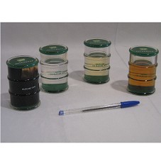 SEIS ESTOJOS (31X13X7 CM) CONTENDO AMOSTRAS DE NAFTA, GASOLINA, DIESEL E ÓLEO BRUTO DO PRIMEIRO PROCESSAMENTO DO ÓLEO DE TUPI. TODOS ACONDICIONADOS EM UM RECIPIENTE DE PLÁSTICO TRANSPARENTE (9,5 CM) NO FORMATO DE UM BARRIL, COM A MARCA DA PETROBRAS NA TAMPA E A DESCRIÇÃO DO CONTEÚDO NA FRENTE.