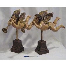 DUAS ESCULTURAS (43 CM CADA) IGUAIS, REPRESENTANDO CADA UMA, UM ANJO VOANDO, TOCANDO UM CLARINETE. POSSUEM ASAS, BRACELETES E LENÇO EM DOURADO. FIXADOS EM HASTE PRESA À BASE ESCALONADA, PINTADA NA COR MARROM. NO FUNDO DA BASE, A INSCRIÇÃO 'ARTE POR ARTE / CENTRO A'TER ECO / MANAGUA, NICARAGUA'. ACOMPANHA BILHETE DO AGENTE, COM A INSCRIÇÃO 'COMPAÑERO LUIZ INACIO LULA DA SILVA / PRESIDENTE DE BRASIL / SUS MANOS'.