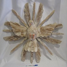 ESCULTURA (76X16X76 CM) DO DIVINO ESPÍRITO SANTO COM RESPLENDOR. FIGURA DE UMA POMBA, COM ASAS ABERTAS, CIRCUNDADA POR RAIOS. CONFECCIONADA EM MADEIRA, COM PINTURA EM PÁTINA BRANCA, E DETALHES (PATAS, BICO E OLHOS) E, ROSA. A PATA DIREITA ENCONTRA-SE LASCADA. ACOMPANHA ETIQUETA DA 'MÃOS DE MINAS', COM INFORMAÇÕES SOBRE A PEÇA.