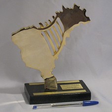 ESCULTURA (19,5 CM) CONFECCIONADA EM METAL DOURADO, REPRESENTANDO O MAPA DO BRASIL, COM UM TRILHO FERROVIÁRIO CORTANDO-O AO CENTRO. FIXADA EM BASE DE MÁRMORE PRETO (2X14X8 CM), ONDE HÁ PLACA COM A GRAVAÇÃO 'LUIZ INÁCIO LULA DA SILVA / PRESIDENTE DA REPÚBLICA / HOMENAGEM ANTF / IV BRASIL NOS TRILHOS / BRASÍLIA, 10 E 11 DE AGOSTO DE 2010'.