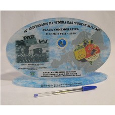 PLACA (15X25 CM) COMEMORATIVA AO '65° ANIVERSÁRIO DA VITÓRIA DAS FORÇAS ALIADAS'. CONFECCIONADA EM ACRÍLICO, DE FORMATO OVAL, COM FUNDO AZULADO. POSSUI A INSCRIÇÃO '65° ANIVERSÁRIO DA VITÓRIA DAS FORÇAS ALIADAS / PLACA COMEMORATIVA 8 DE MAIO 1945-2010 / EXCELENTÍSSIMO SENHOR LUIZ INÁCIO LULA DA SILVA / PRESIDENTE DA REPÚBLICA FEDERATIVA DO BRASIL / BRASIL, NAÇÃO SOBERANA / GENIVAL MÁXIMO DE OLIVEIRA VETERANO FEBEANO / JOSÉ DE ARIMATÉA PEREIRA DE ALBUQUERQUE DIRETOR ADESG/PB'. FIXADA EM BASE DE MESMO MATERIAL.