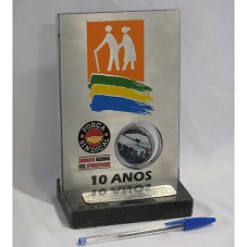 PLACA (19X12,5 CM) COMEMORATIVA AOS '10 ANOS DO SINDICATO NACIONAL DOS APOSENTADOS', CONFECCIONADA EM AÇO ESCOVADO, COM DESENHO DE UM CASAL DE IDOSOS. ENCAIXADA EM BASE DE MÁRMORE PRETO (2X13X8 CM) ONDE HÁ PLACA METÁLICA CONTENDO A INSCRIÇÃO 'HOMENAGEM DOS 10 ANOS DO SINDICATO NACIONAL DOS APOSENTADOS, PENSIONISTAS E IDOSOS DA FORÇA SINDICAL AO EXMO PRESIDENTE LUIS INÁCIO LULA DA SILVA PELA IMPORTANTE CONTRIBUIÇÃO E PARTICIPAÇÃO EM NOSSA HISTÓRIA.'.