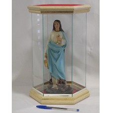 IMAGEM DE 'SANTA MARTA'. ESCULTURA (27,5 CM) MODELADA EM GESSO, E PINTADA. SANTA DE TÚNICA BRANCA E MANTO AZUL, SEGURANDO OBJETOS DOURADOS NAS MÃOS. AOS SEUS PÉS, A FIGURA DE UM DRAGÃO. ACONDICIONADA EM REDOMA DE VIDRO, COM BASE E TAMPA EM MADEIRA.
