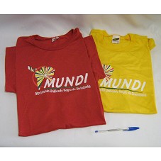 DUAS CAMISETAS IGUAIS (TAM GG E M), UMA EM MALHA VERMELHA; OUTRA EM AMARELO, AMBAS DE MANGA CURTA. NA FRENTE, ESTAMPA COM A INSCRIÇÃO 'MUNDI / MOVIMENTO UNIFICADO NEGRO DE DIVINÓPOLIS'.