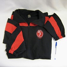 CASACO (TAM G) ACOLCHOADO E FORRADO, CONFECCIONADO EM TECIDO PRETO COM DETALHES EM VERMELHO. NA FRENTE, BORDADO EM VERMELHO E BRANCO, A INSCRIÇÃO 'MEDICINA' E O SÍMBOLO DA MESMA. ATRÁS, 'MEDICINA / UFSJ / DIVINÓPOLIS - MG'.