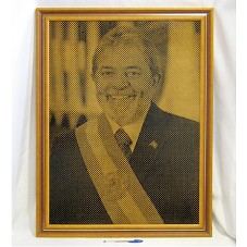 QUADRO (87X67 CM) EMOLDURANDO FOTOGRAFIA (77X57 CM) DO PRESIDENTE LULA, VESTIDO COM A FAIXA PRESIDENCIAL, EM FRENTE AO PALÁCIO DA ALVORDA. FOTOGRAFIA EM NEGATIVO, GRAVADA SOBRE MADEIRA, COM MARCAÇÕES DE PONTOS DE DIFERENTES TAMANHOS, PINTADOS DE PRETOS. POSSUI MOLDURA EM MADEIRA. ATRÁS, ETIQUETA DO FABRICANTE 'ADONAI COMUNICAÇÃO VISUAL'.
