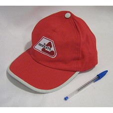 BONÉ EM TECIDO VERMELHO, COM DETALHE EM CINZA. NA FRENTE, A INSCRIÇÃO 'SEMEATO', E LOGOMARCA DA EMPRESA, BORDADOS.