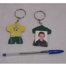 DOIS CHAVEIROS IGUAIS, CONFECCIONADOS EM BORRACHA. POSSUEM FORMATO DO UNIFORME DA SELEÇÃO BRASILEIRA DE FUTEBOL (CAMISA E SHORT). EM UM DELES, FOTOGRAFIA DE UMA CRIANÇA (MENINO) COLADA.