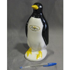 ESCULTURA (23,5 CM) EM CERÂMICA BRANCA, REPRESENTANDO UM PINGUIM DE GELADEIRA. NO PEITO DELE, A LOGOMARCA DO 'EMPÓRIO PINGUIM'.