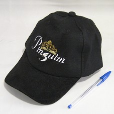 BONÉ, EM BRIM PRETO. NA FRENTE, BORDADO EM BRANCO E AMARELO, A LOGOMARCA DO 'EMPÓRIO PINGUIM'. ATRÁS, 'RIBEIRÃO PRETO'.