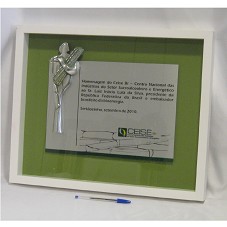 TÍTULO EMBAIXADOR BRASILEIRO DA BIOENERGIA. PLACA EMOLDURADA (25X35 CM), CONFECCIONADA EM METAL PRATEADO CONTENDO A INSCRIÇÃO 'HOMENAGEM DO CEISE BR - CENTRO NACIONAL DAS INDÚSTRIAS DO SETOR SUCROALCOOLEIRO E ENERGÉTICO AO SR. LUIZ INÁCIO LULA DA SILVA, PRESIDENTE DA REPÚBLICA FEDERATIVA DO BRASIL E EMBAIXADOR BRASILEIRO DA BIOENERGIA. SERTÃOZINHO, SETEMBRO DE 2010.'. AO LADO DA PLACA, ESCULTURA EM METAL, FIGURA REPRESENTATIVA DE UMA PESSOA SEGURANDO UM FEIXE DE CANA DE AÇÚCAR. FIXADA EM QUADRO (42X52 CM) DE MOLDURA BRANCO, TAMPO DE VIDRO E FUNDO VERDE.