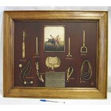 QUADRO (62,5X52 CM) EM MADEIRA ESCURA APRESENTANDO PETRECHOS DE GAÚCHO ESCULPIDOS E A PINTURA DE DOIS GAÚCHOS MONTADOS À CAVALO. POSSUI UMA PLACA EM METAL PRATEADO COM A INSCRIÇÃO 'DEL INTENDENTE DPTAL. DE RIVERA / DR. MARNE OSORIO LIMA L / SR. PRESIDENTE DE LA REPUBLICA FEDERATIVA DEL BRASIL / DON LUIS IGNACIO LULA DA SILVA / CON MOTIVO DE SU VISITA A LA FRONTERA DE LA PAZ / RIVERA 30.07.10'.
