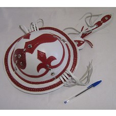 CHAPÉU DE VAQUEIRO, TIPO CANGACEIRO, CONFECCIONADO EM COURO BRANCO, COM DETALHES EM VERMELHO E METAL PRATEADO. NA PARTE INTERNA, CARIMBO DO ARTESÃO 'ARTESÃO IRINEU DE ZÉ DO MESTRE / CEL: (87) 9101-9113'.