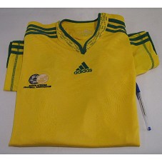 CAMISA DE FUTEBOL OFICIAL DA SELEÇÃO DA ÁFRICA DO SUL. CAMISA AMARELA, COM DETALHES VERDES, E A INSCRIÇÃO 'SOUTH AFRICA FOOTBALL ASSOCIATION'. NÃO POSSUI NUMERAÇÃO.