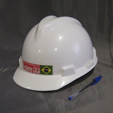 CAPACETE DE PROTEÇÃO, UTILIZADO EM CONSTRUÇÃO CIVIL, NA COR BRANCA. NA FRENTE, ETIQUETA COM FUNDO VERMELHO, CONTENDO A BANDEIRA DO BRASIL E A INSCRIÇÃO 'FERROVIA TRANSNORDESTINA / PRESIDENTE LULA'. POSSUI AJUSTE INTERNO.