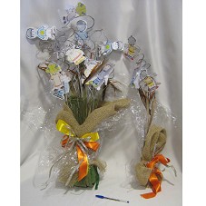 DOIS BUQUÊS, ONDE AS FLORES SÃO DESENHOS REPRESENTANDO CRIANÇAS, CONFECCIONADOS EM PAPEL E PINTADOS, TENDO NA PARTE INTERNA DE CADA UM, FRASE COM DIREITO DA CRIANÇA. COLADOS EM HASTES ESPIRALADAS, PINTADAS NA COR PRATA. JUNTO COM ESTAS, FOLHAS E FLORES (FORAM RETIRADAS E DESCARTADAS PARA NÃO APODRECER O RESTANTE DO MATERIAL).