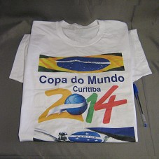 CAMISETA (TAM GG) EM MALHA BRANCA, DE MANGA CURTA. NA FRENTE, ESTAMPA COM A BANDEIRA DO BRASIL E DO PARANÁ, E A LOGOMARCA DA COPA DO MUNDO 2014.