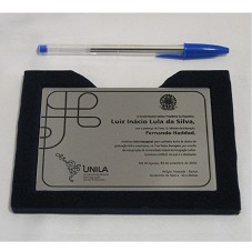 PLACA (8,5X12,3 CM) COMEMORATIVA, CONFECCIONADA EM METAL PRATEADO, CONTENDO A INSCRIÇÃO 'O EXCELENTÍSSIMO SENHOR PRESIDENTE DA REPÚBLICA, LUIZ INÁCIO LULA DA SILVA, COM A PRESENÇA DO EXMO. SR. MINISTRO DA EDUCAÇÃO, FERNANDO HADDAD, MINISTROU AULA INAUGURAL PARA A PRIMEIRA TURMA DE ALUNOS DE GRADUAÇÃO LATINO-AMERICANOS, NO CINE-TEATRO BARRAGEIRO, POR OCASIÃO DA INAUGURAÇÃO DA UNIVERSIDADE FEDERAL DA INTEGRAÇÃO LATINO-AMERICANA (UNILA), DA QUAL É O IDEALIZADOR. FOZ DO IGUAÇU, 02 DE SETEMBRO DE 2010. / HÉLGIO TRINDADE - REITOR / GERÔNIMO DE SIERRA - VICE-REITOR'. FIXADA EM BASE FORRADA DE VELUDO AZUL MARINHO E ACONDICIONADA EM ESTOJO FORRADO COM MESMO MATERIAL.