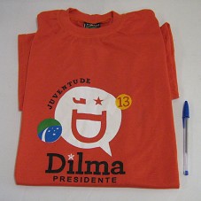 CAMISETA (TAM G) EM MALHA VERMELHA, DE MANGA CURTA. NA FRENTE, ESTAMPA COM A INSCRIÇÃO 'JUVENTUDE / 13 / DILMA PRESIDENTE'.