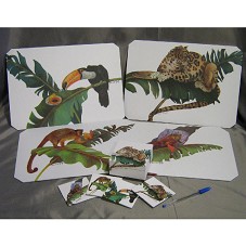 CONJUNTO DE QUATRO JOGOS AMERICANOS (27X38 CM CADA) E QUATRO PORTA-COPOS (8X8 CM CADA). POSSUEM ESTRUTURA EM MADEIRA, RECOBERTAS COM PLÁSTICO TEXTURIZADO, ONDE HÁ GRAVURA IMPRESSA, DE PINTURA DA ARTISTA DOMINIQUE JARDY. PINTURA REPRESENTANDO ANIMAIS SILVESTRES (ONÇA, TUCANO, MICO, ETC) SOBRE FOLHAS VERDES. PORTA-COPOS ACOMPANHAM MESMA PINTURA DO JOGO AMERICANO, E ESTÃO ACONDICIONADOS EM ESTOJO DE MADEIRA, SEGUINDO MESMO PADRÃO.