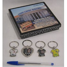 CONJUNTO DE QUATRO CHAVEIROS, CONFECCIONADOS EM METAL PRATEADO. TRÊS DELES, NO FORMATO DE UMA CAMISETA (DOIS COM A CAMISA DO TIME DE FUTEBOL CORINTHIANS; UMA DO BRASIL); E UM NO FORMATO DE UM CORAÇÃO COM O SÍMBOLO DO CORINTHIANS. TODOS POSSUEM A INSCRIÇÃO 'LULA / ESC. PADRE LUIGI'. ACONDICIONADOS EM CAIXA DE MADEIRA (3X16X16 CM) COM PINTURA CRAQUELADA, NA COR PRETA COM BRANCO. NA TAMPA, FOTOGRAFIA DA ESCOLA PADRE LUIGI SALVUCCI, E A INSCRIÇÃO 'LEMBRANÇA DOS ALUNOS E FUNCIONÁRIOS DA ESCOLA MUNICIPAL PADRE LUIGI - VILA C / FOZ DO IGUAÇU - PR / VISITA DO PRESIDENTE LULA'.