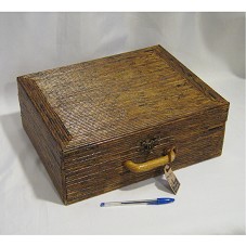 MALETA (29,5X37X14 CM) CONFECCIONADA EM MADEIRA, REVESTIDA EXTERNAMENTE COM ROLETES DE PAPEL JORNAL ENVERNIZADOS. POSSUI TRINCO METÁLICO E ALÇA EM MADEIRA. NA ALÇA, ETIQUETA COM A INSCRIÇÃO 'BEM VINDO' E DESENHO DAS CATARATAS DO IGUAÇU. NA PARTE INTERNA, MESMO DESENHO E INSCRIÇÃO 'PROJETO MEMÓRIA DAS CATARATAS / IGUAÇU 70 ANOS'.