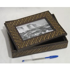 CAIXA PORTA-RETRATO (23X18X4,5 CM) CONFECCIONADA EM MADEIRA TRABALHADA COM TEXTURA IMITANDO PALHA TRANÇADA. NA TAMPA, ESPAÇO PARA COLOCAÇÃO DE FOTOGRAFIA. POSSUI UMA FOTOMONTAGEM, EM PRETO E BRANCO, MOSTRANDO DIVERSAS PESSOAS DIANTE DAS CATARATAS DO IGUAÇU, E O PRESIDENTE LULA ENTRE ELAS.