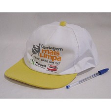 BONÉ EM TECIDO BRANCO, COM ABA AMARELA. NA FRENTE, A INSCRIÇÃO 'CONTAGEM MAIS LIMPA / A GENTE CONTA COM VOCÊ', E DESENHO ESTILIZADO DE UMA PESSOA JOGANDO O LIXO NO LIXO. POSSUI LOGOMARCA DA 'PREFEITURA DE CONTAGEM' E DA EMPRESA 'FOSSIL'.