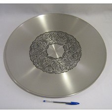 PLACA CIRCULAR (48 CM), DECORATIVA, CONFECCIONADA EM ESTANHO, COM DESENHO CENTRAL, DE MOTIVOS FLORAIS E DE ARABESCOS, LEMBRANDO UMA MANDALA. ACONDICIONADA EM ESTOJO DE MADEIRA. NA TAMPA, PLACA METÁLICA CONTENDO A INSCRIÇÃO 'KEPPEL OFFSHORE AND MARINE / PRESENTED TO HIS EXCELLENCY LUIZ INÁCIO LULA DA SILVA / PRESIDENT OF BRAZIL / FROM KEPPEL FELS BRASIL / ON THE OCCASION OF THE CHRISTENING OF P-57 / 7 OCTOBER 2010'.